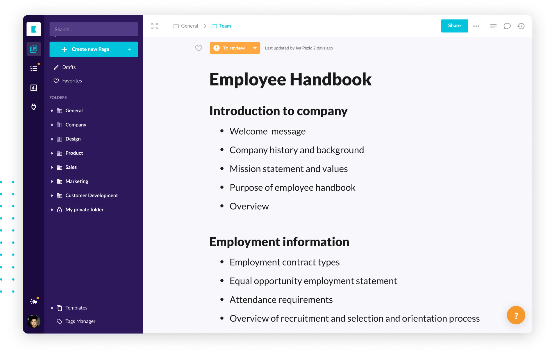 The ease of use is the central theme why my team likes Kipwise. Visually it's easy to read. Navigation is easy and organized well. Content is easy to find and edit. Going through the process of documenting content is helping the team as a whole to be more consistent.