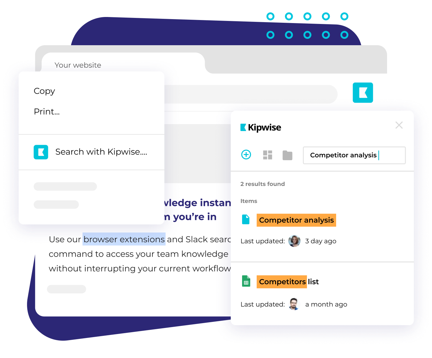 Gain universal access to your company’s internal knowledge by installing the Kipwise Chrome or Safari extensions. Simply key in your search terms or highlight any text on a web page to perform a quick search. Source the information you need fast while working in any web app.