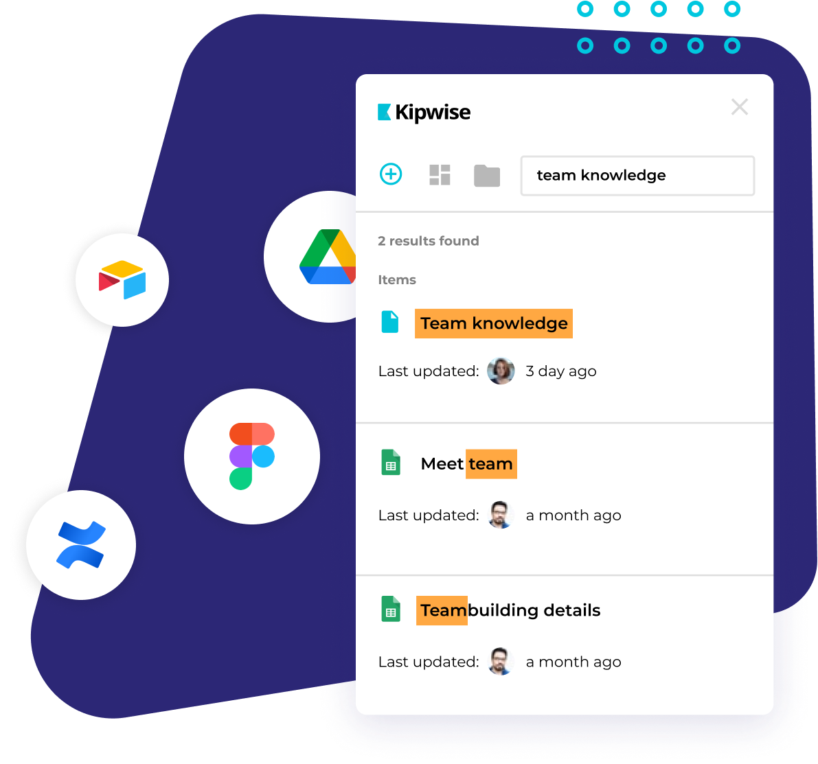 Search across Kipwise and the tools that you have connected, such as Google Drive, OneDrive and Confluence, using the Kipwise Safari Extension. Gain access to the information you need in seconds without needing to switch between tabs.