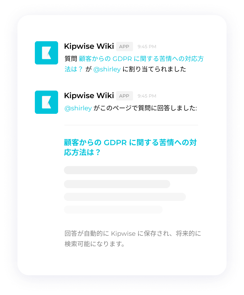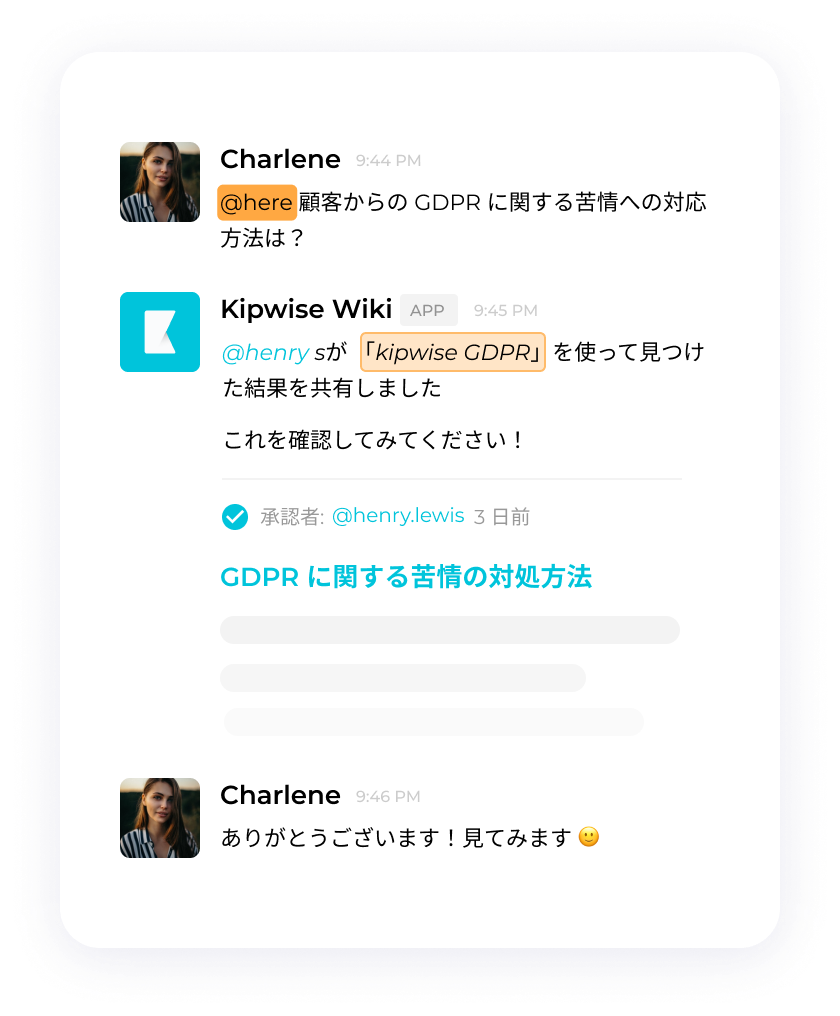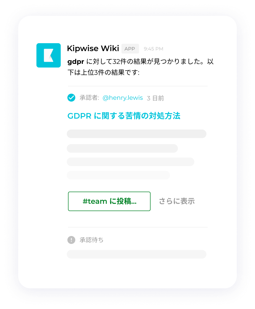 KipwiseのSlack連携は、試した社内ナレッジ管理ツールの中で最も使いやすかったです。日常のワークフローとうまく連携しており、使うのが簡単なため、同じような質問が繰り返されることが減り、社員全員がナレッジハブの構築に積極的に貢献するようになりました。