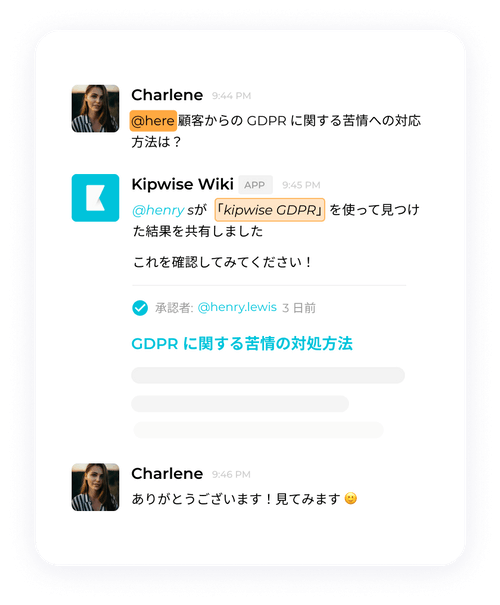 「社内Wikiツールを導入したものの、社員が使ってくれない」というのは、社内Wikiツール利用企業によく聞かれる声です。Kipwiseはこの問題を解決するために、例えば誰かが社内Wikiを検索せずにSlackで質問した場合、「Answer with Kipwise」という機能を使って、Kipwiseの社内Wikiのリンクと共に返信することができます。また、Slackのショートカットコマンド(/kipwise 検索キーワード)でSlackを離れることなく、素早く検索することができます。こうした機能で、どんどん「まずはKipwiseで検索してみよう」という習慣が根付くことでしょう。