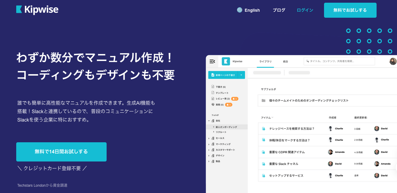 Kipwiseは、チームの知識を一箇所で管理し、共有するためのツールです。Slackを普段から使っているチームに特におすすめで、Slackから離れることなく社内Wiki(または社内マニュアル)の作成、編集、検索ができます。操作は直感的で、誰でも簡単に読みやすい社内ナレッジを構築できます。