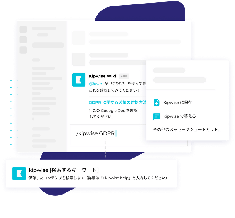 Kipwiseは、Slackから離れることなくナレッジを管理・共有できる社内マニュアル作成ツールです。ワークフローの一環として、情報の検索・保存・共有をよりスムーズに行えます。
