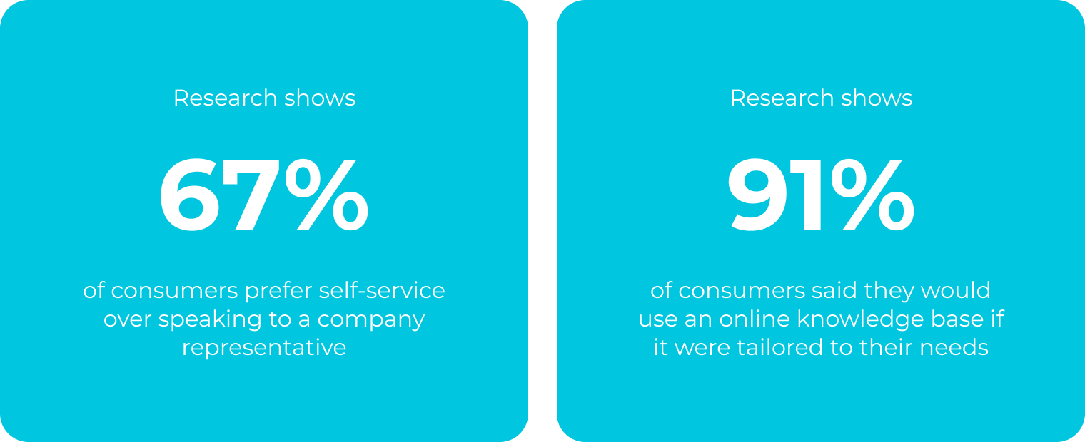As the general public is becoming more and more tech-savvy, online users simply prefer to find answers on their own. Several studies have shown that 67% of consumers prefer self-service over speaking to a company representative and 91% of consumers said they would use an online knowledge base if it were available and tailored to their needs.