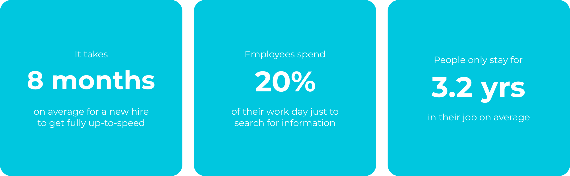 Third, it helps to retain knowledge when employees leave your company. On average, people only stay in their job for 3.2 years. By making sure knowledge is documented and shared, you can help make sure important company wisdom won’t walk out of your door together as your people leave.