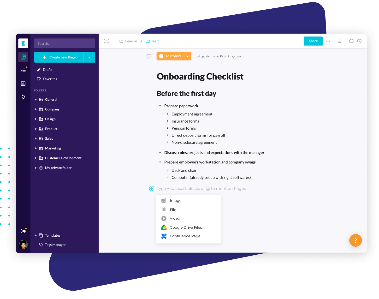 Kipwise offers great integrations with our existing tools so setting up is easy. With Kipwise, documenting team guidelines and workflows has become so much easier. This helps us onboard new teammates faster and do our work more efficiently.