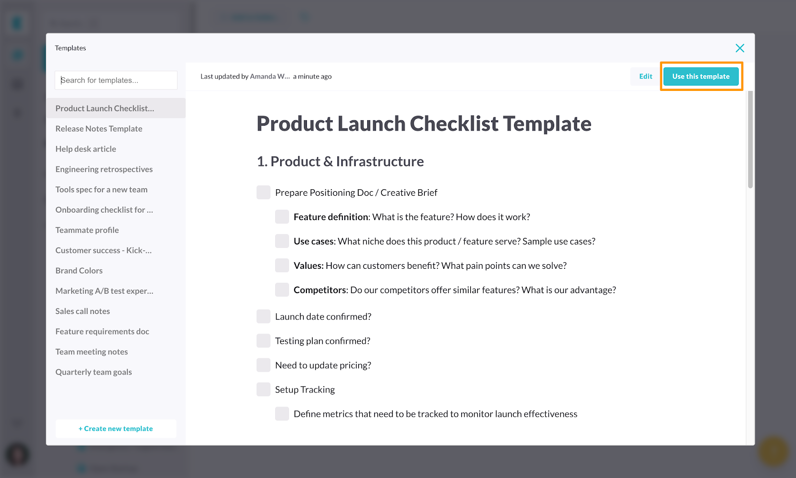 3. Search for “Product Launch Checklist Template” and select Use this template