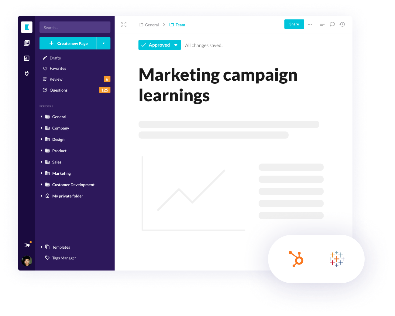 Collaborate on campaign planning and content drafts. Share brand guidelines to ensure a consistent brand voice. Document A/B test learnings so teammates can learn from the experience.