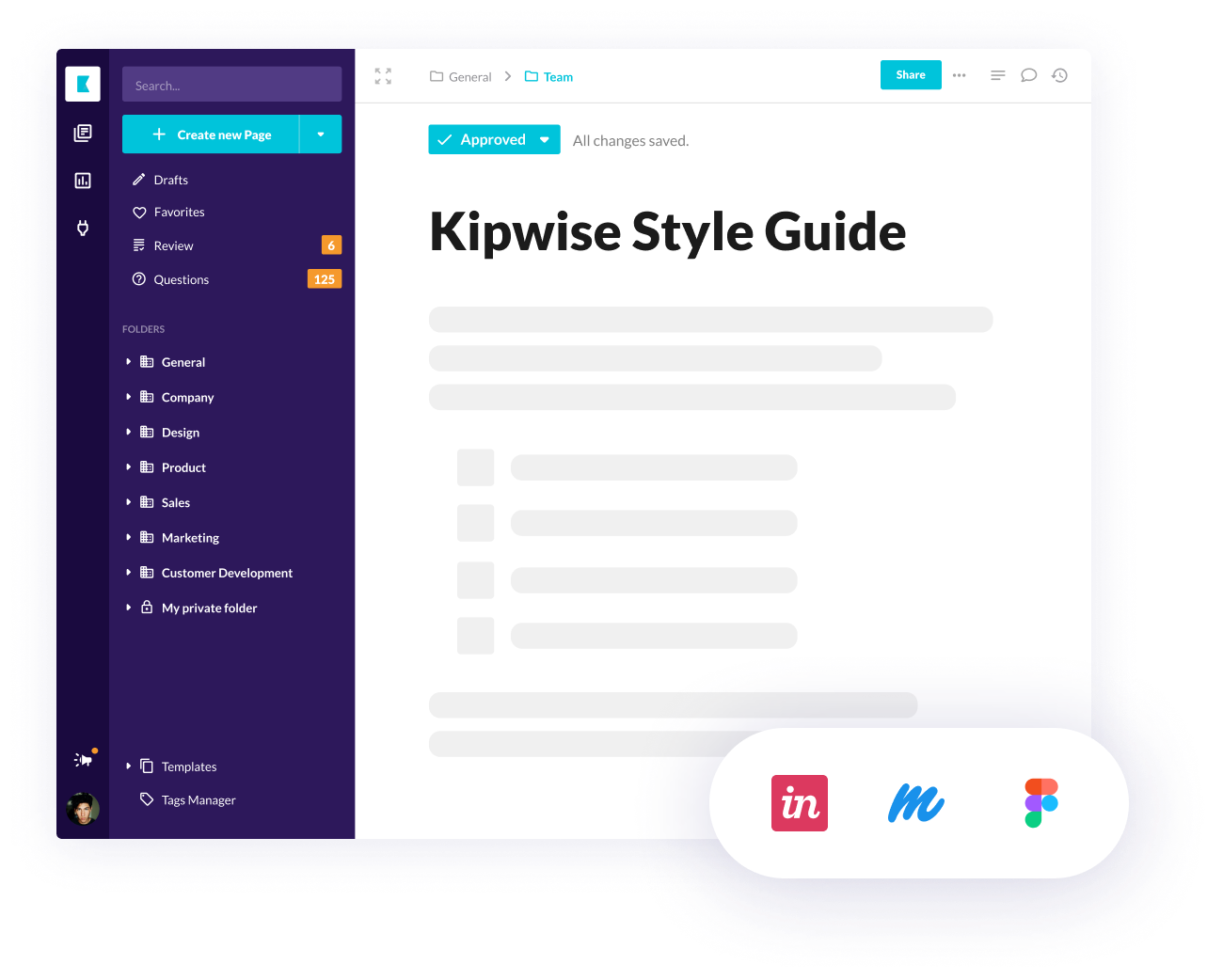 Share style guide, design best practices to ensure a consistent look-and-feel and user experience for your product. Document test results and analytics so your teammates can learn from the experience and understand what works and what doesn’t.