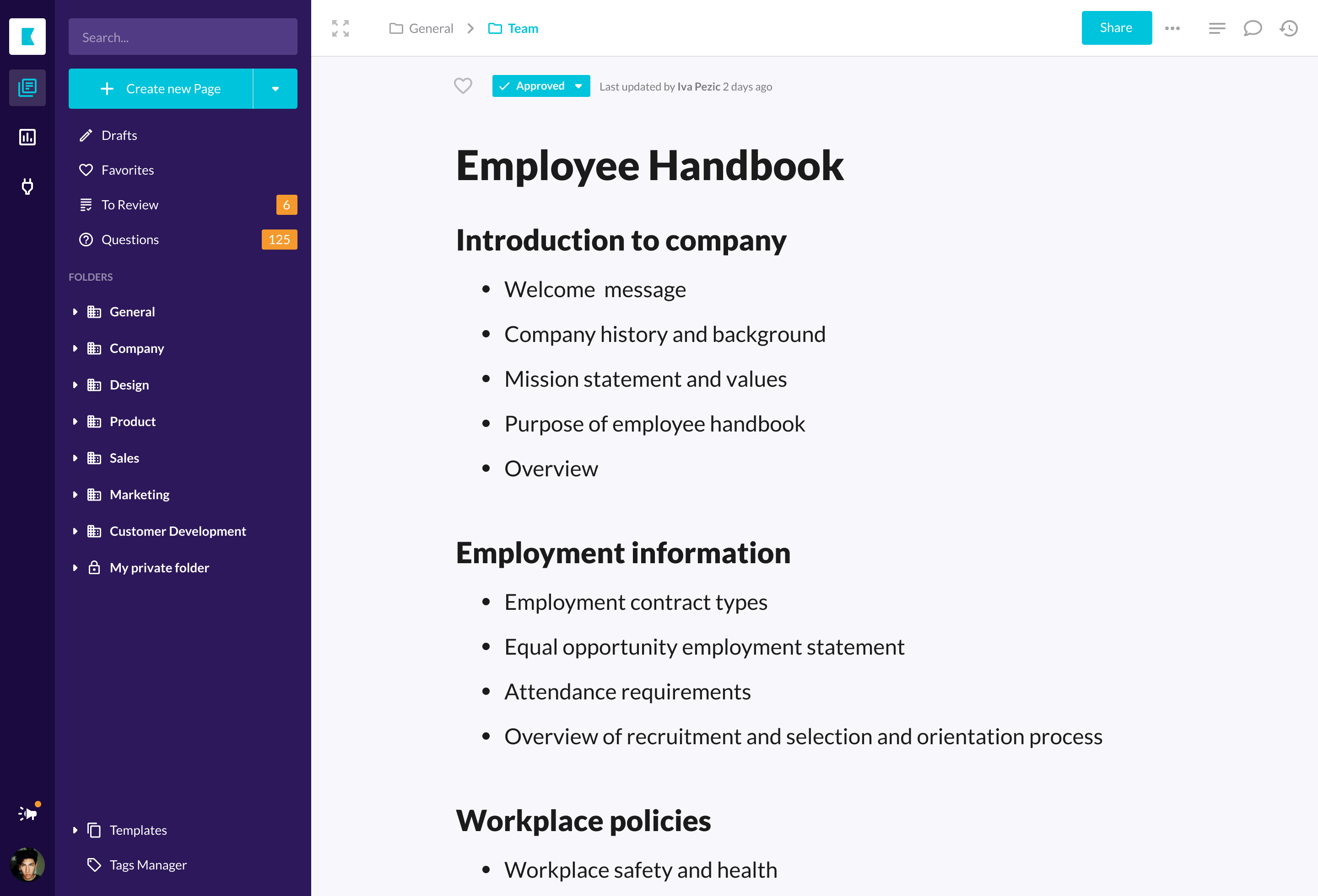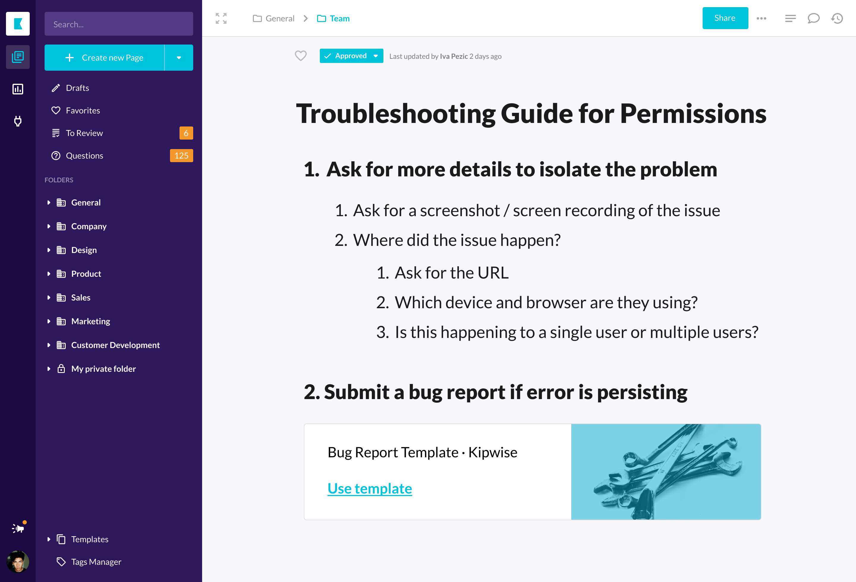 The ease of use is the central theme why my team likes Kipwise. Visually it's easy to read. Navigation is easy and organized well. Content is easy to find and edit. Going through the process of documenting content is helping the team as a whole to be more consistent.